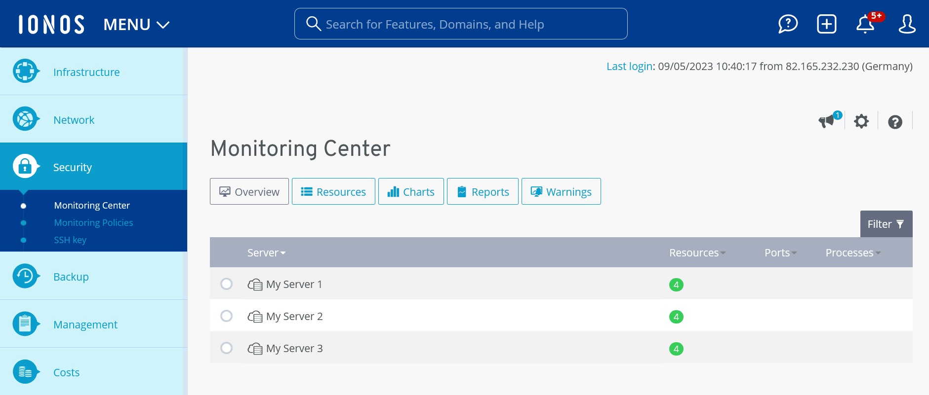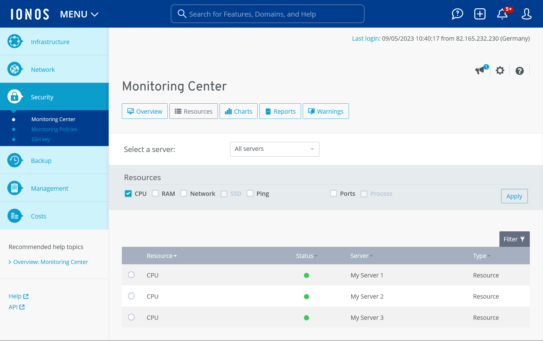 Under the menu item Warnings, warnings that were issued for the monitored servers are displayed. You can either view all warnings or filter them by the server of your choice. Additionally, you can select individual resources to further narrow down the results.