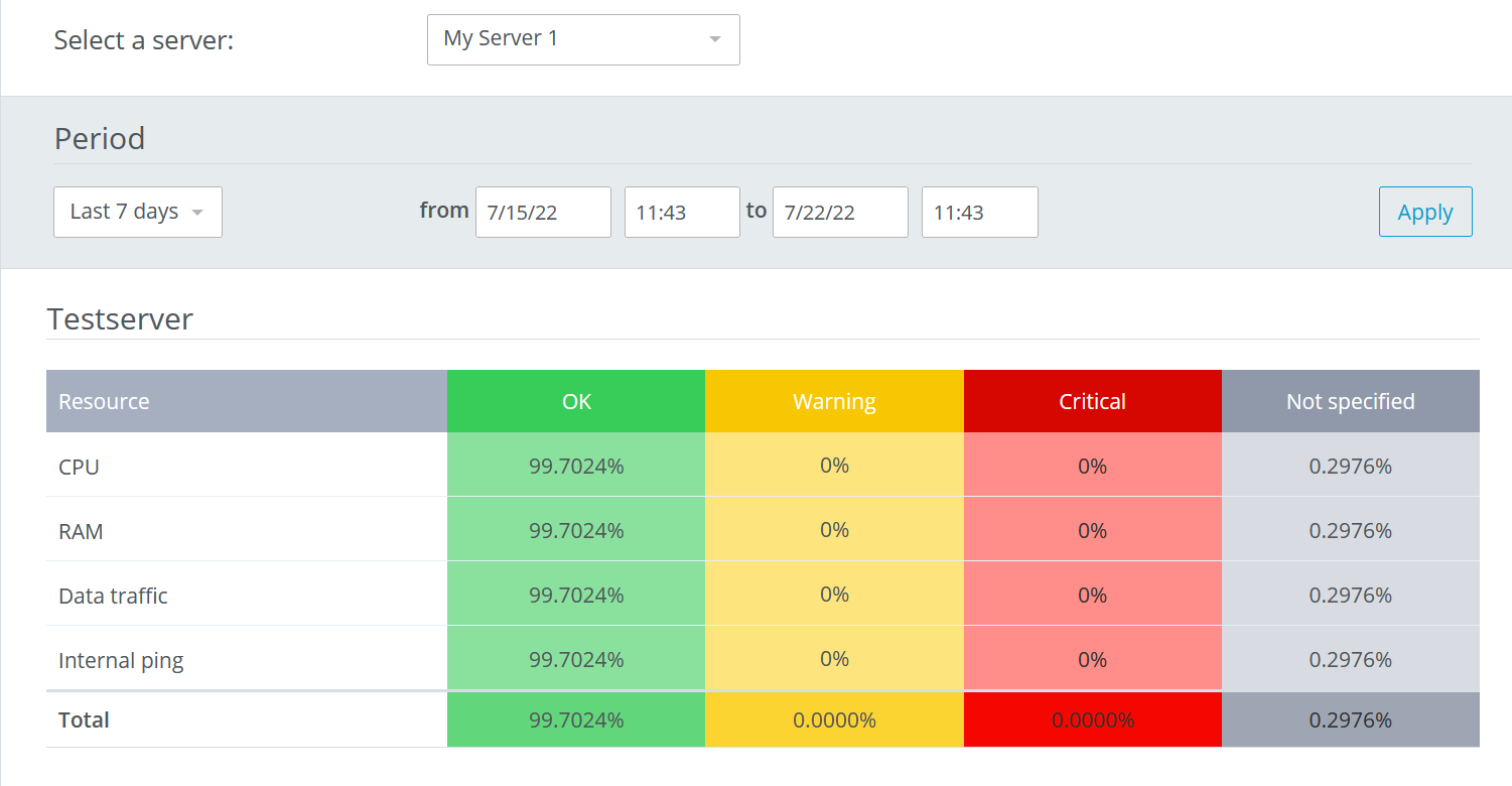 Under the menu item Reports, you can display the length of time your resources have been in a certain, defined status for each monitored resource. You can either display an evaluation for all servers or for a specific server. Additionally, you can individually define the time period displayed.