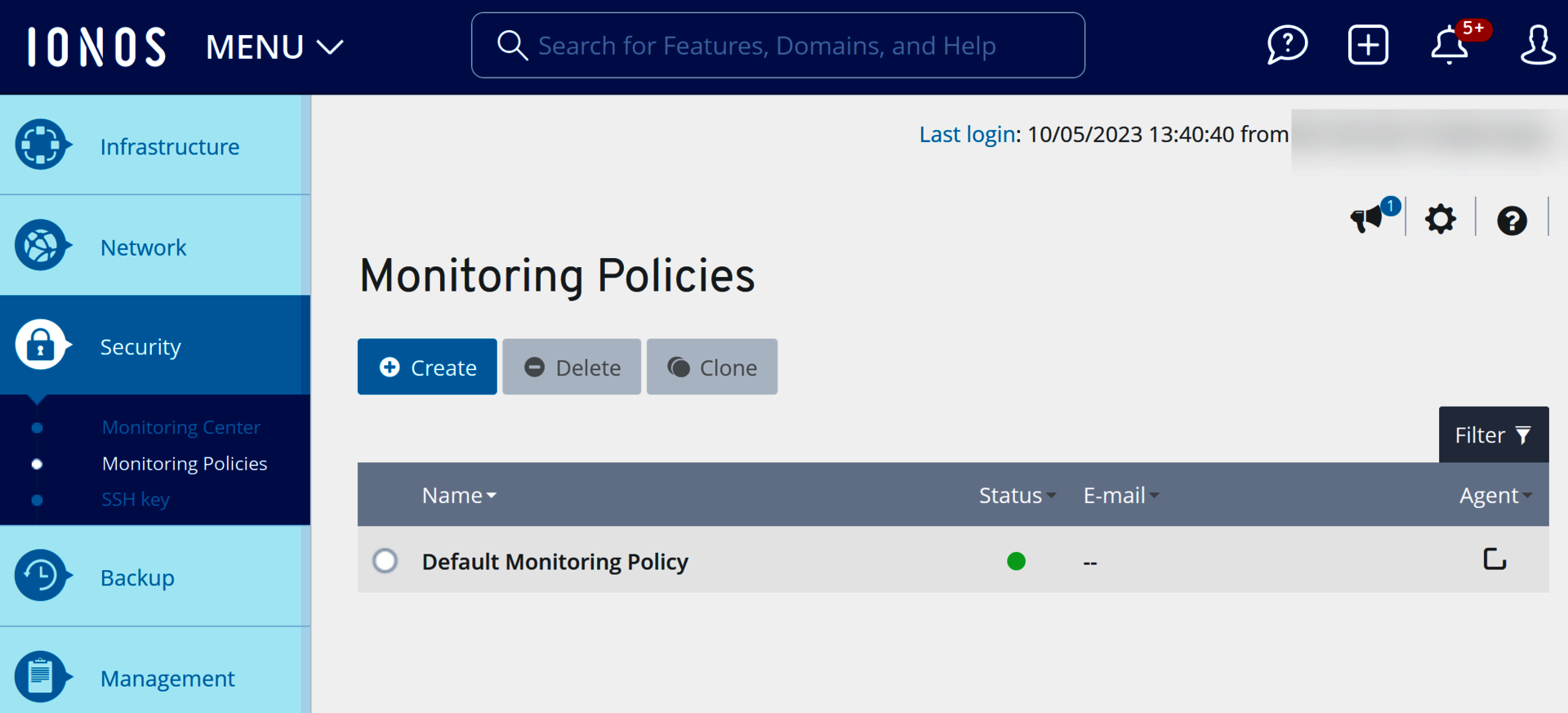 In the Security > Monitoring Policies section of the Cloud Panel, all of the monitoring policies you have configured are listed in a table. This table lists the most important information about each monitoring policy: