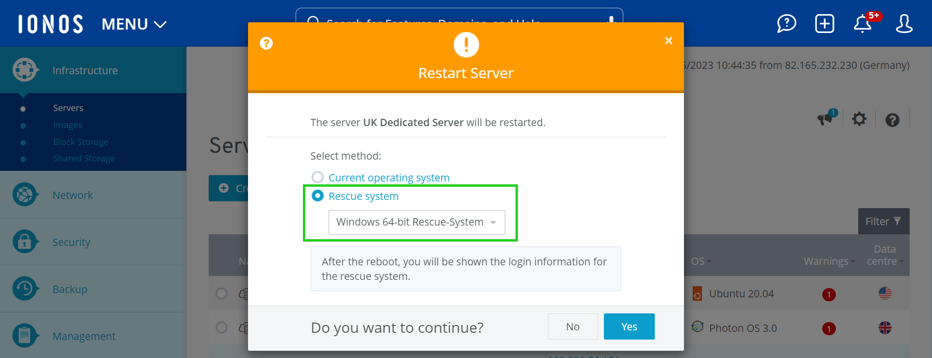 Select the Rescue System method and the desired rescue system. The bit rate of the rescue system (32- or 64-bit) must match the bit rate of the operating system installed on the server.