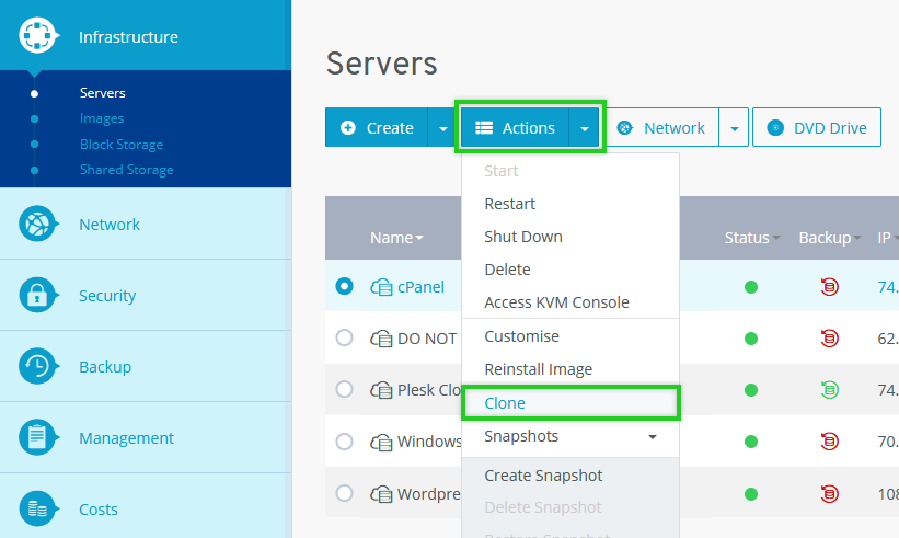 Click Actions > Clone at the top of the list of your servers.