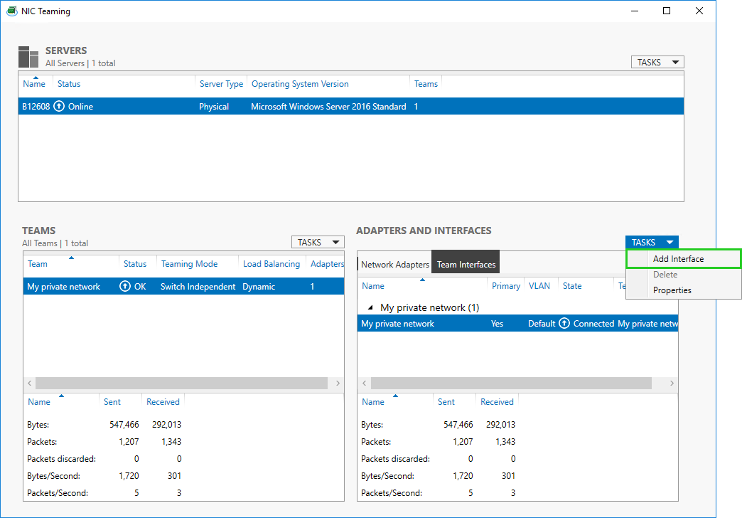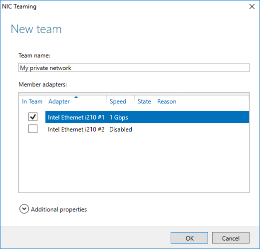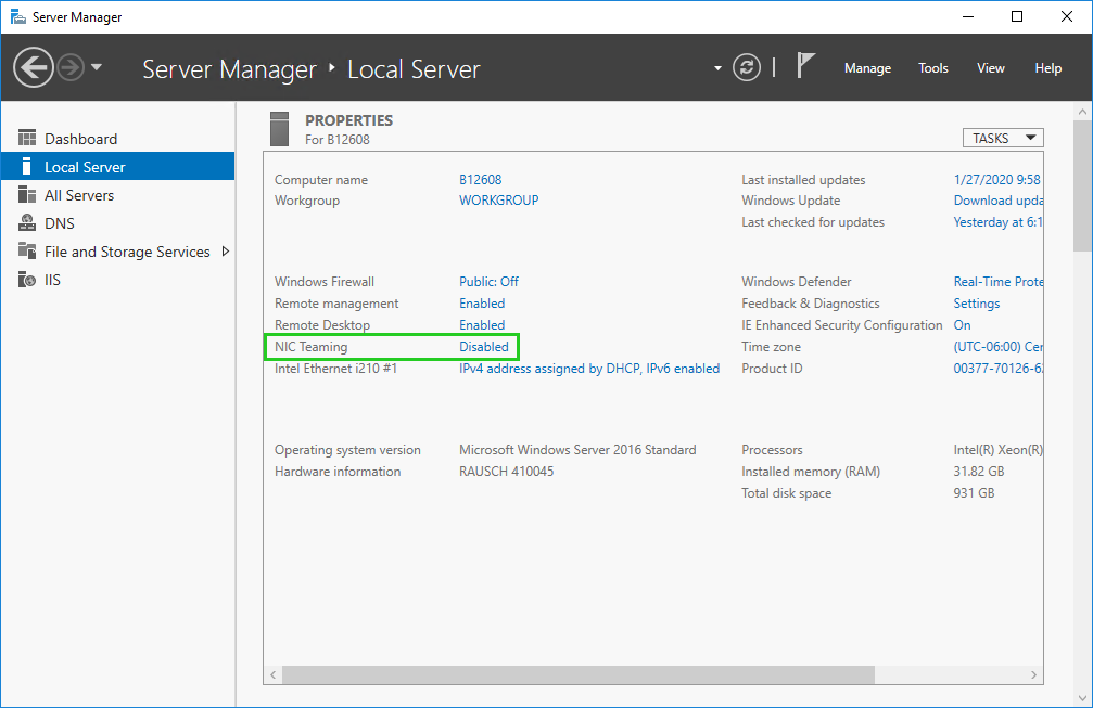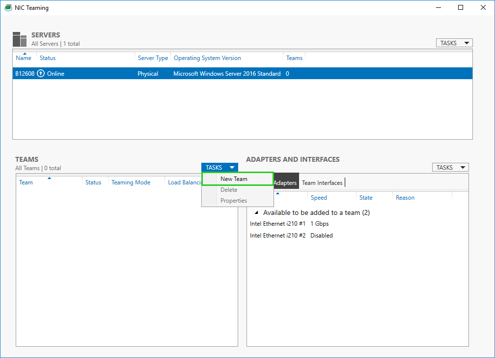 In the Properties pane, select NIC Teaming. The NIC Teaming window opens.