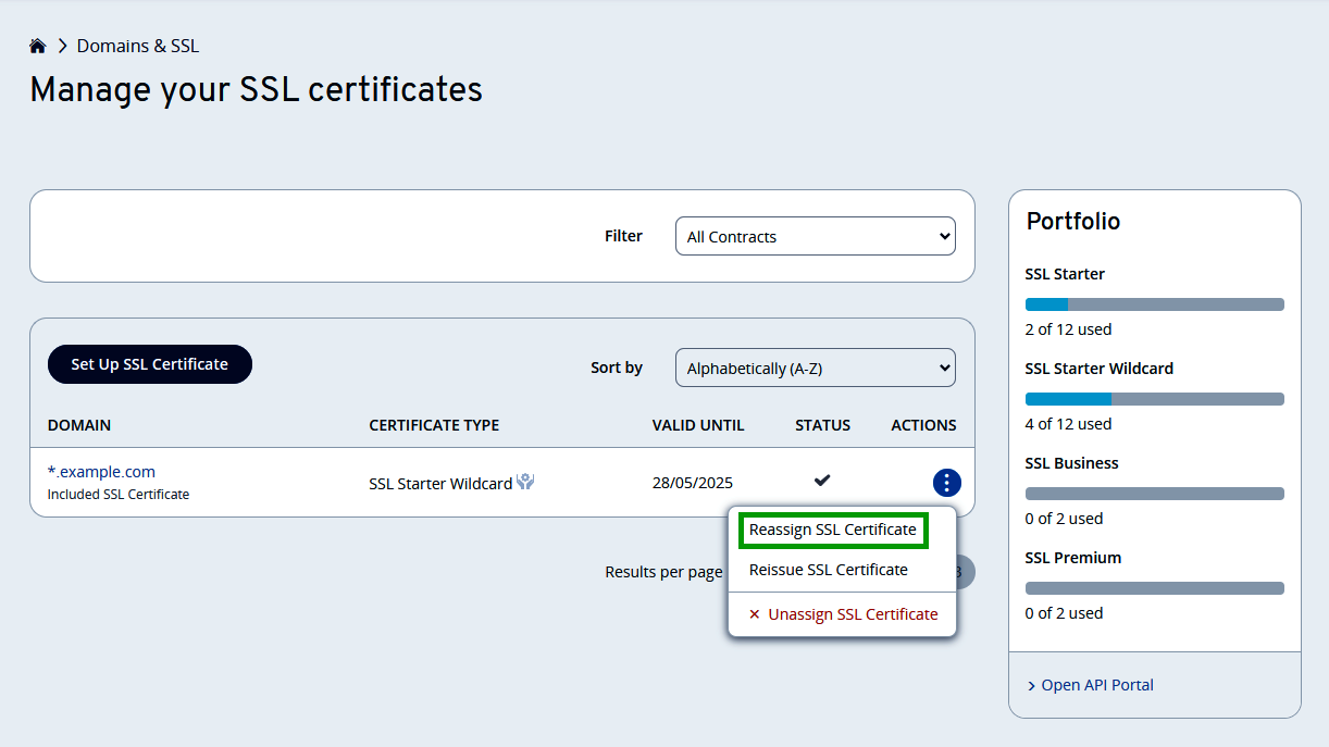 - Click on the three dots in the Actions column to the right of the domain whose certificate is to be reassigned.