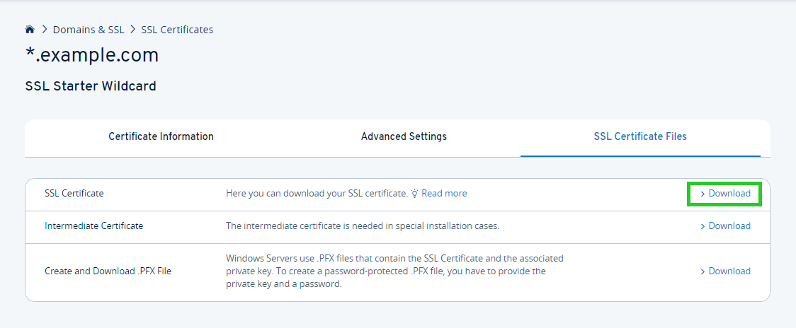 To save the SSL certificate on your computer, click on Download in the SSL certificate files tab under SSL certificate.