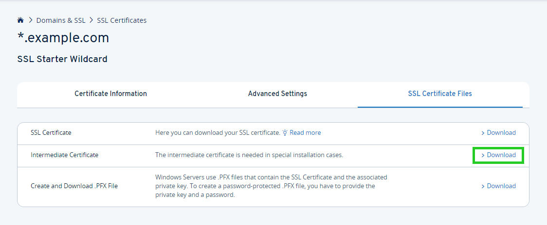To save the Intermediate certificate on your computer, click on Download in the Advanced settings section next to Intermediate certificate.