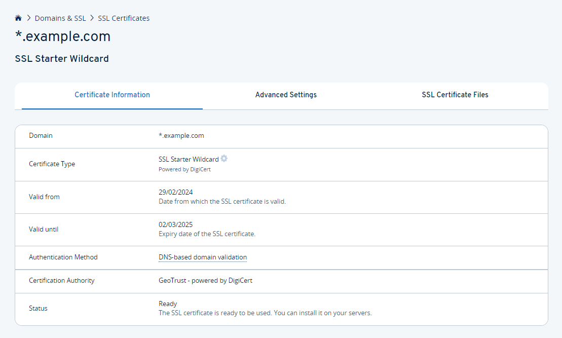 - Click on the SSL certificate to be managed. The certificate settings and the certificate status are displayed in the Certificate information tab.