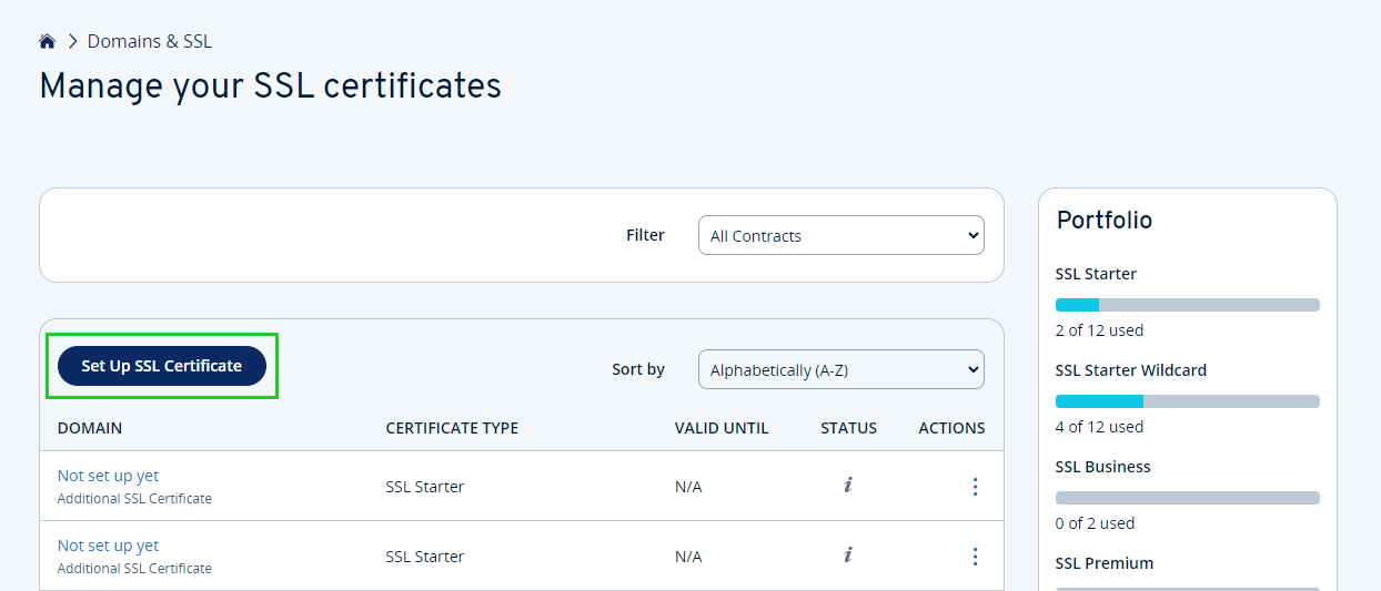 The page listing all your domains is displayed. - Click on Manage in the section SSL certificates under Portfolio. The overview of your SSL certificates is displayed.