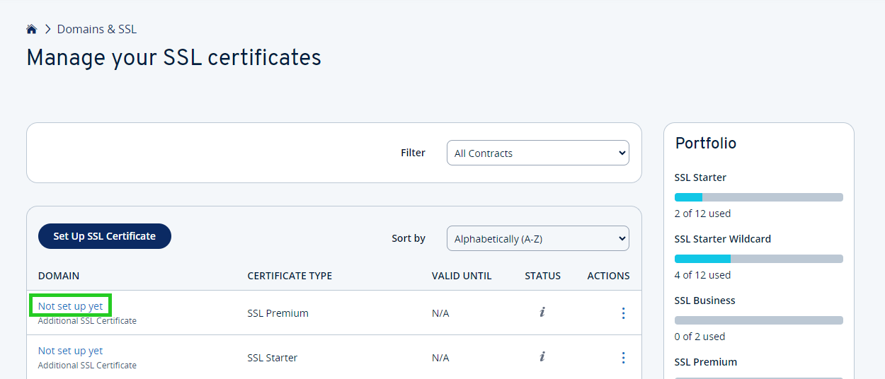 Search for the SSL certificate of type SSL Premium that has not yet been set up.