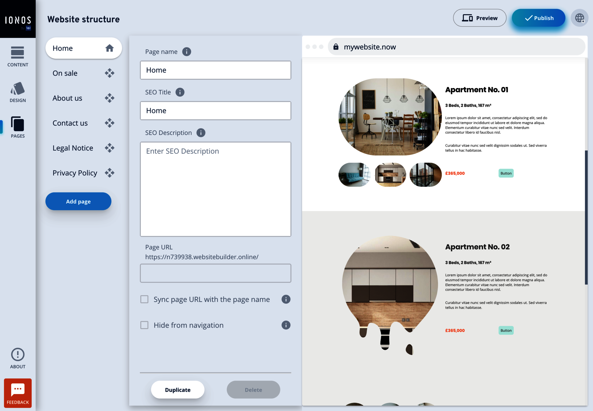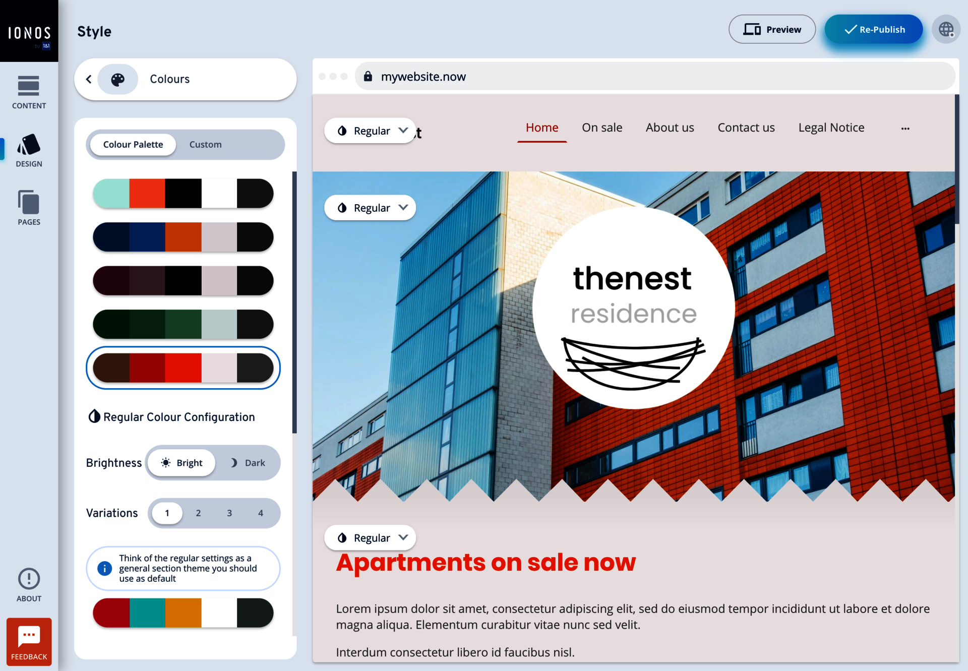 Now give your website your personal touch: Change the color scheme with one click. Adjust the font and set accents with shapes and other spacing options.