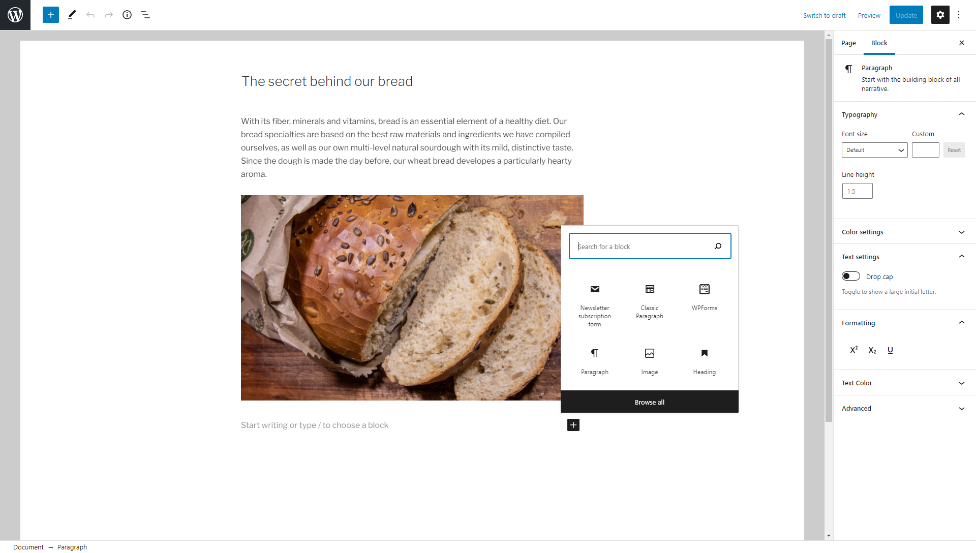For content creation, you can use the Gutenberg editor in WordPress. This allows an intuitive compilation of texts, graphics, videos, etc. like a word processor. By default, WordPress distinguishes between pages and posts for content publishing. Pages are mainly used for static content, such as the Terms & Conditions or Privacy Policy. Articles are usually used for continuous publications, such as blogs. Basically, you are free with the usage types and use them as it is best for your project.