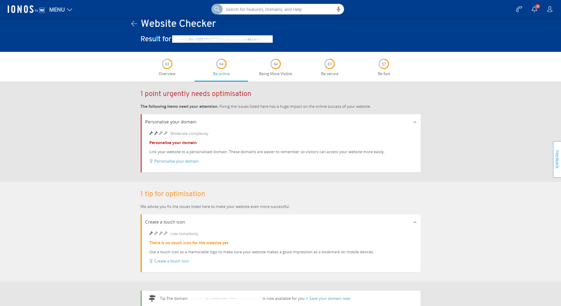 The free IONOS Website Checker checks four aspects of your website: Website appearance, findability in search engines, security, and speed.